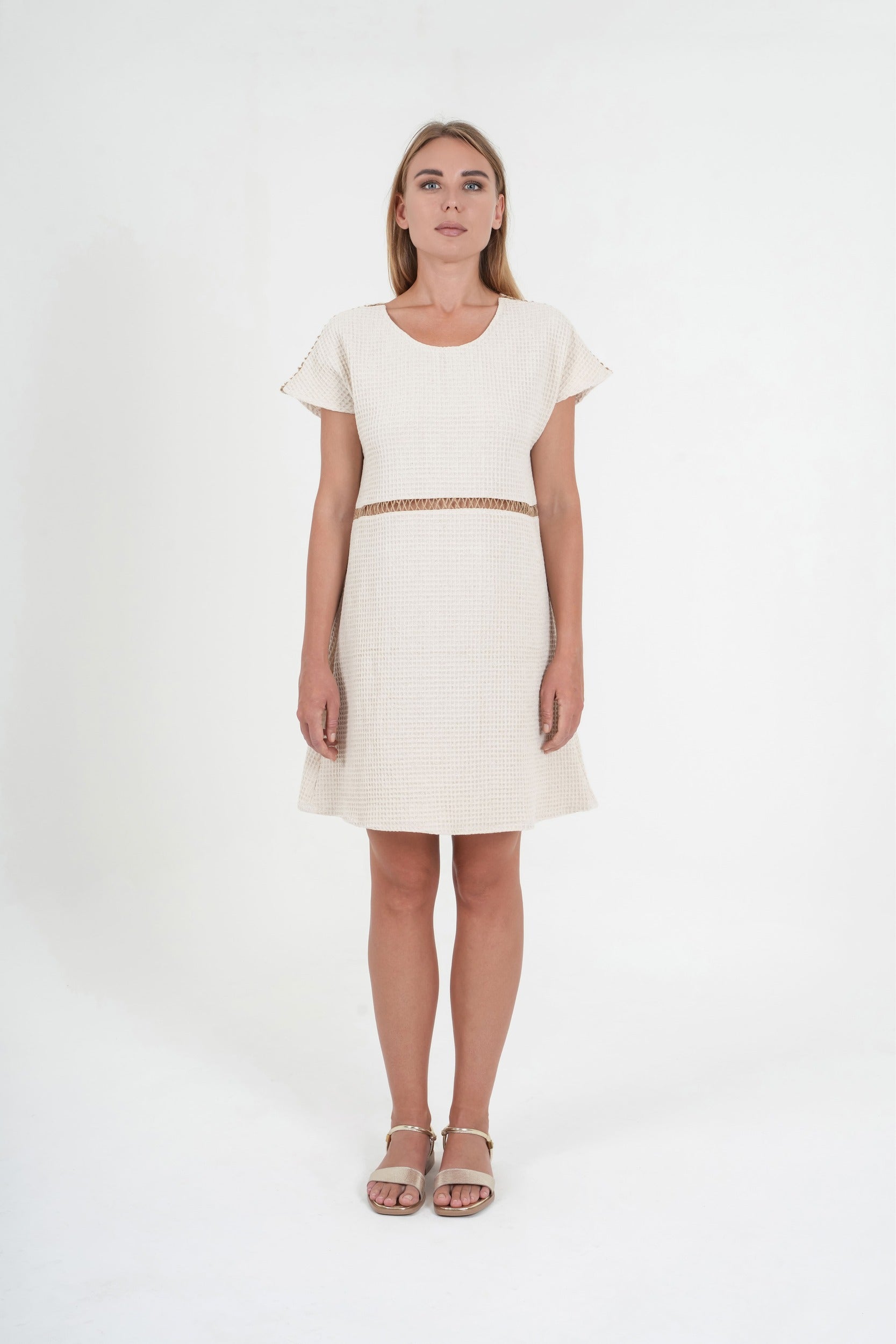 Meet the Adorn Dress – your go-to for warm-weather elegance with a playful twist. This short dress is crafted from textured waffle cotton fabric, delicately trimmed with natural jute edges for a rustic yet refined look. Designed for comfort and style, it brings effortless charm to any setting, from weekend brunches to summer getaways.
