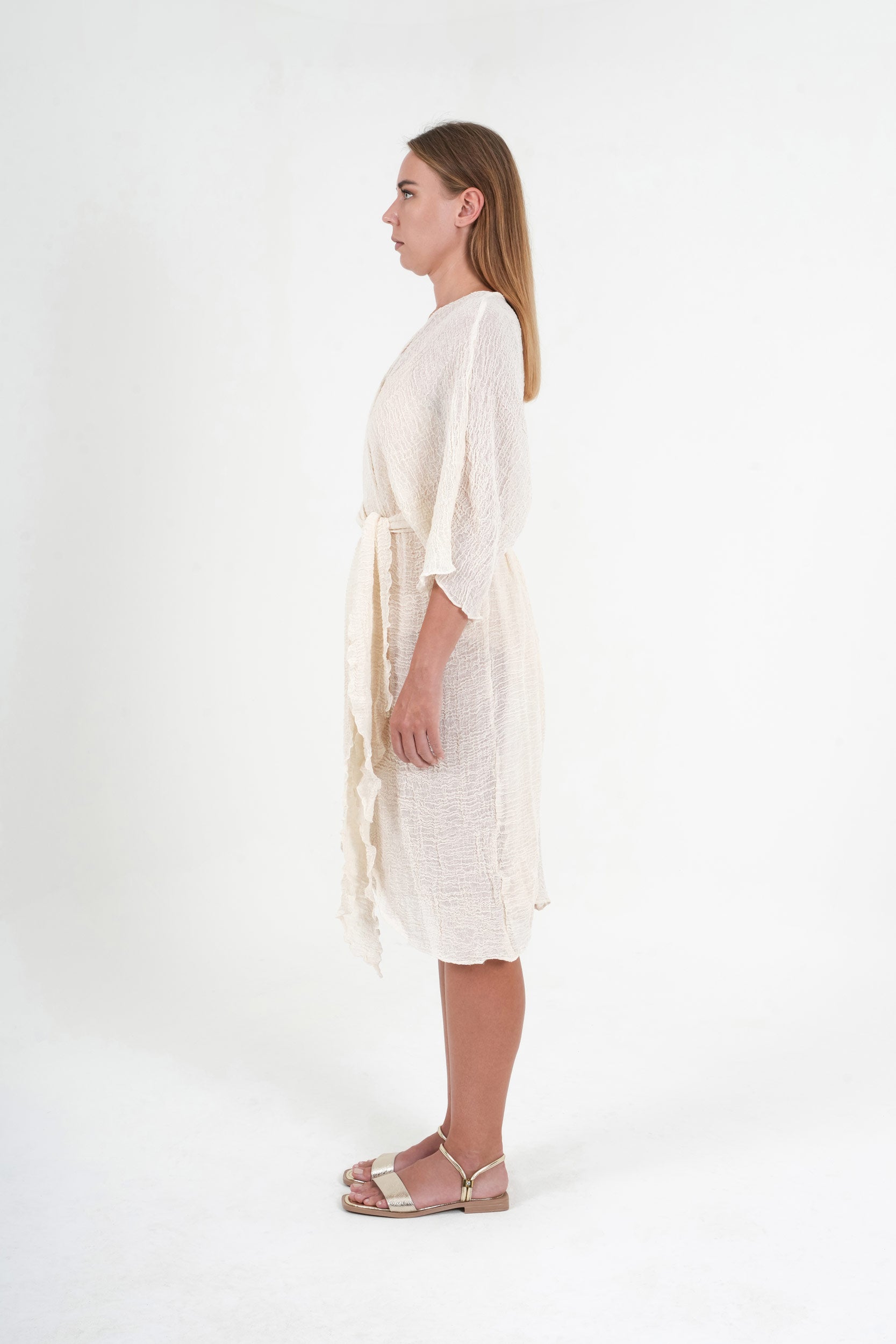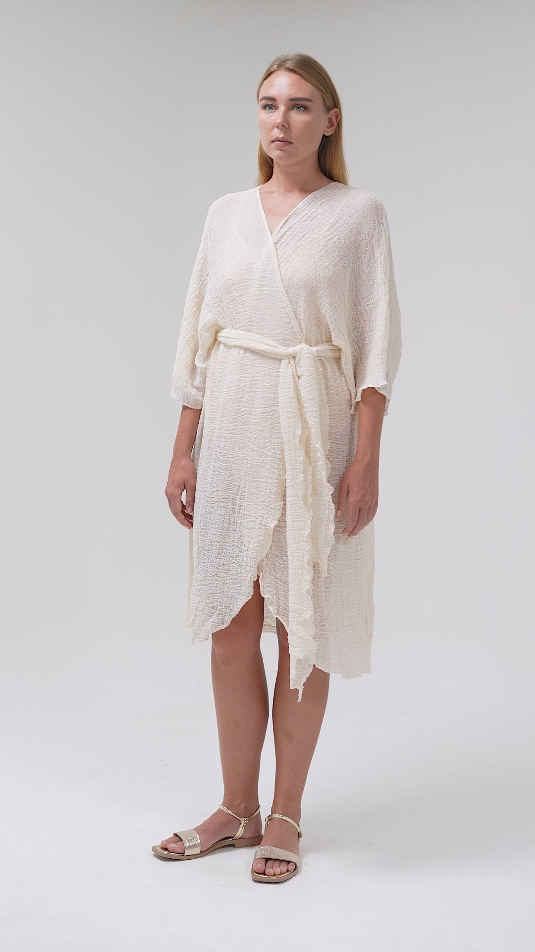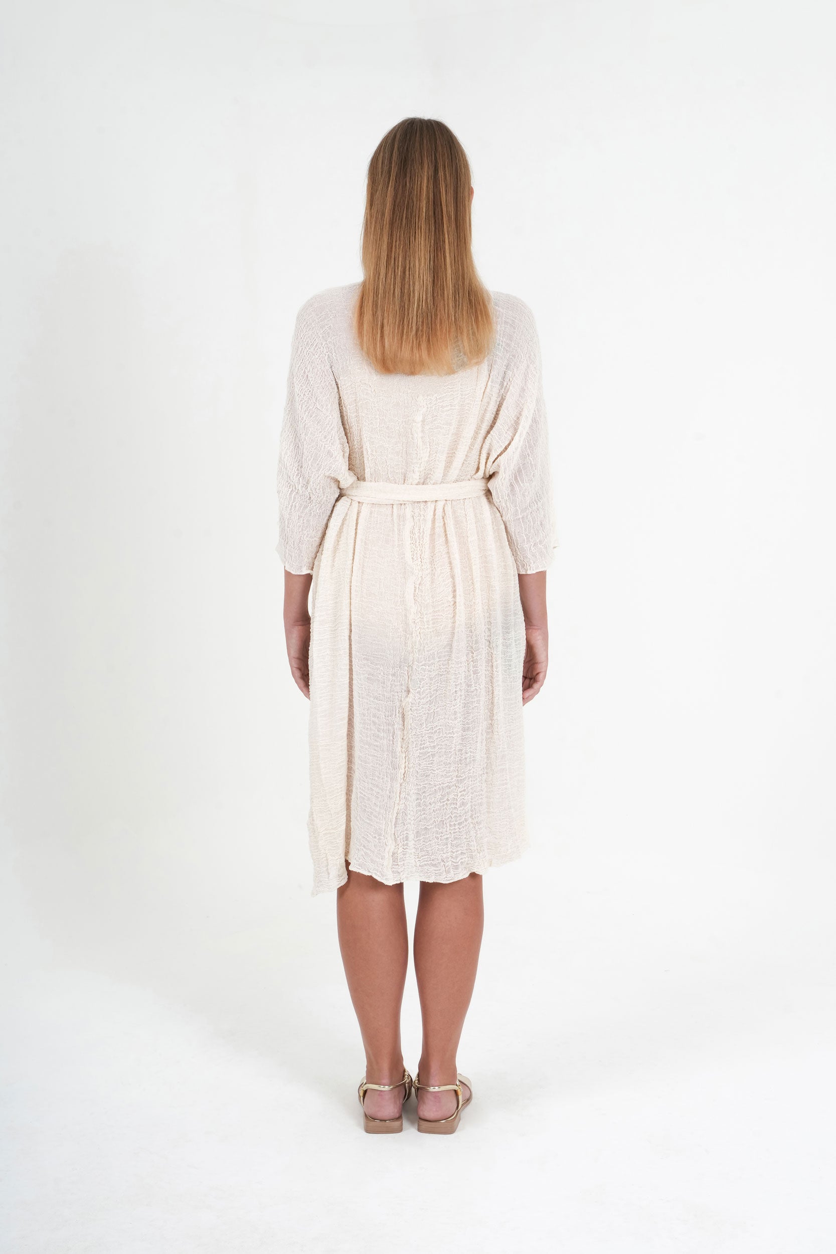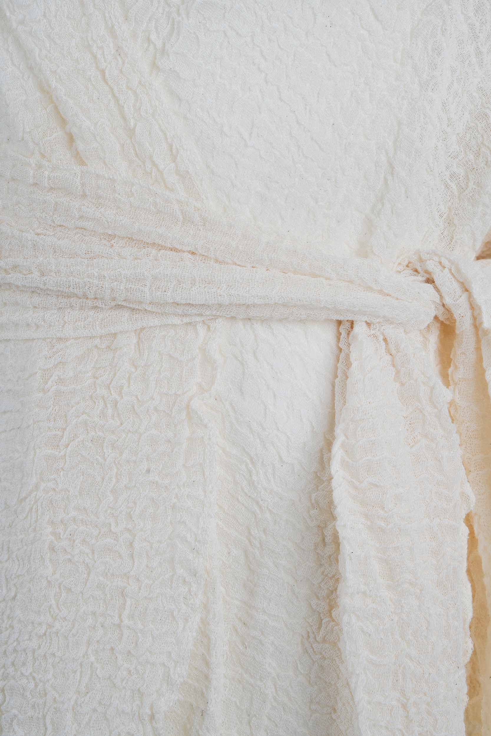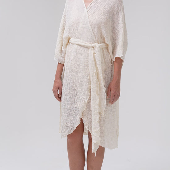 The natural off-white tone highlights the raw beauty of the fabric, while the relaxed silhouette—complete with wide sleeves and a detachable belt—offers styling versatility. Wear it loose over swimwear, or belted as a lightweight robe or resort-ready layer.