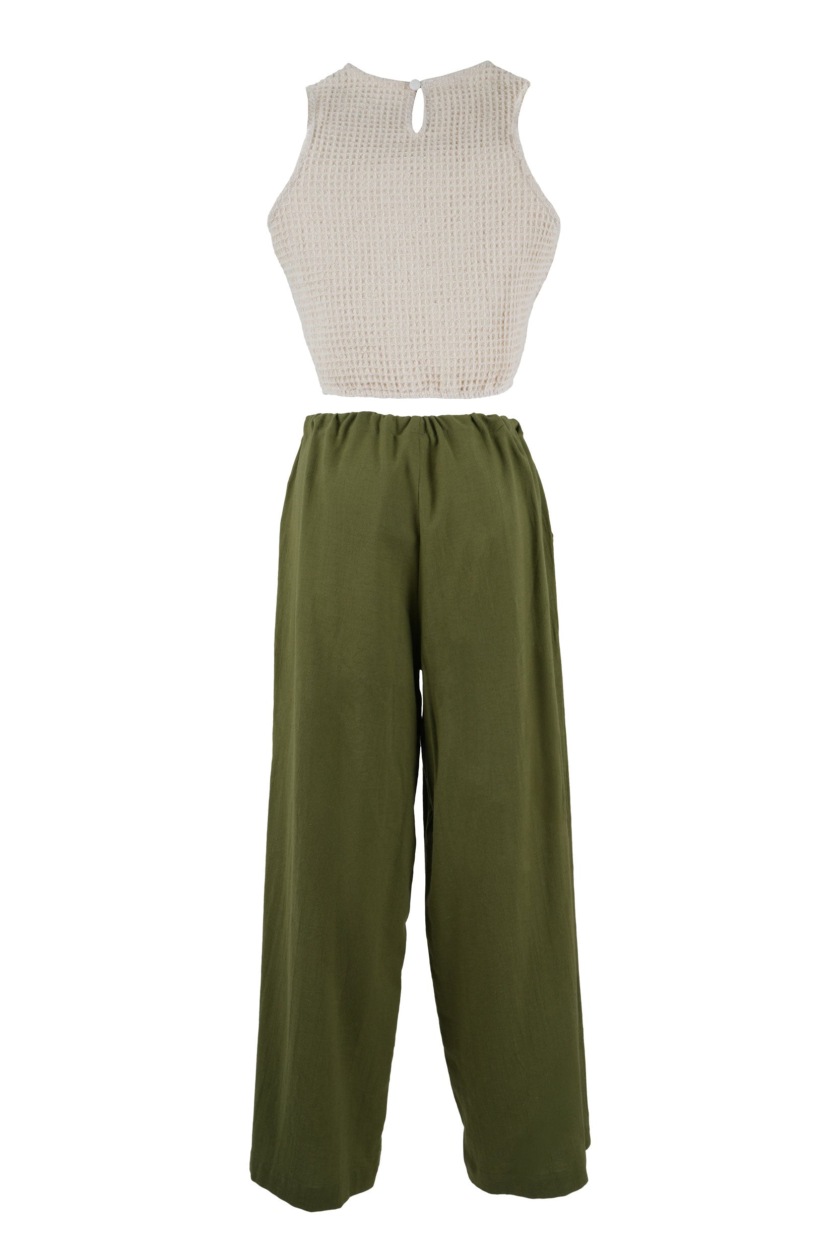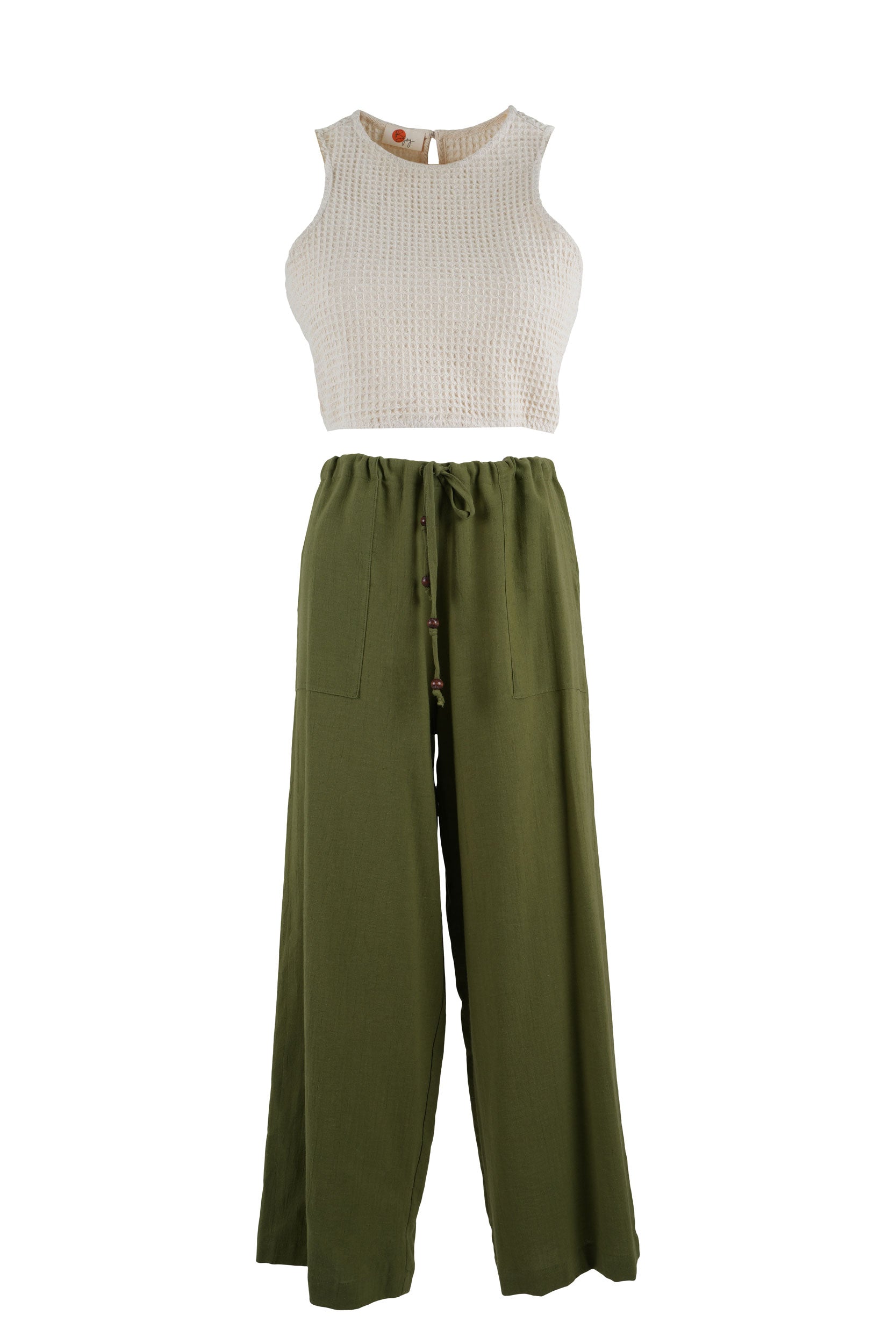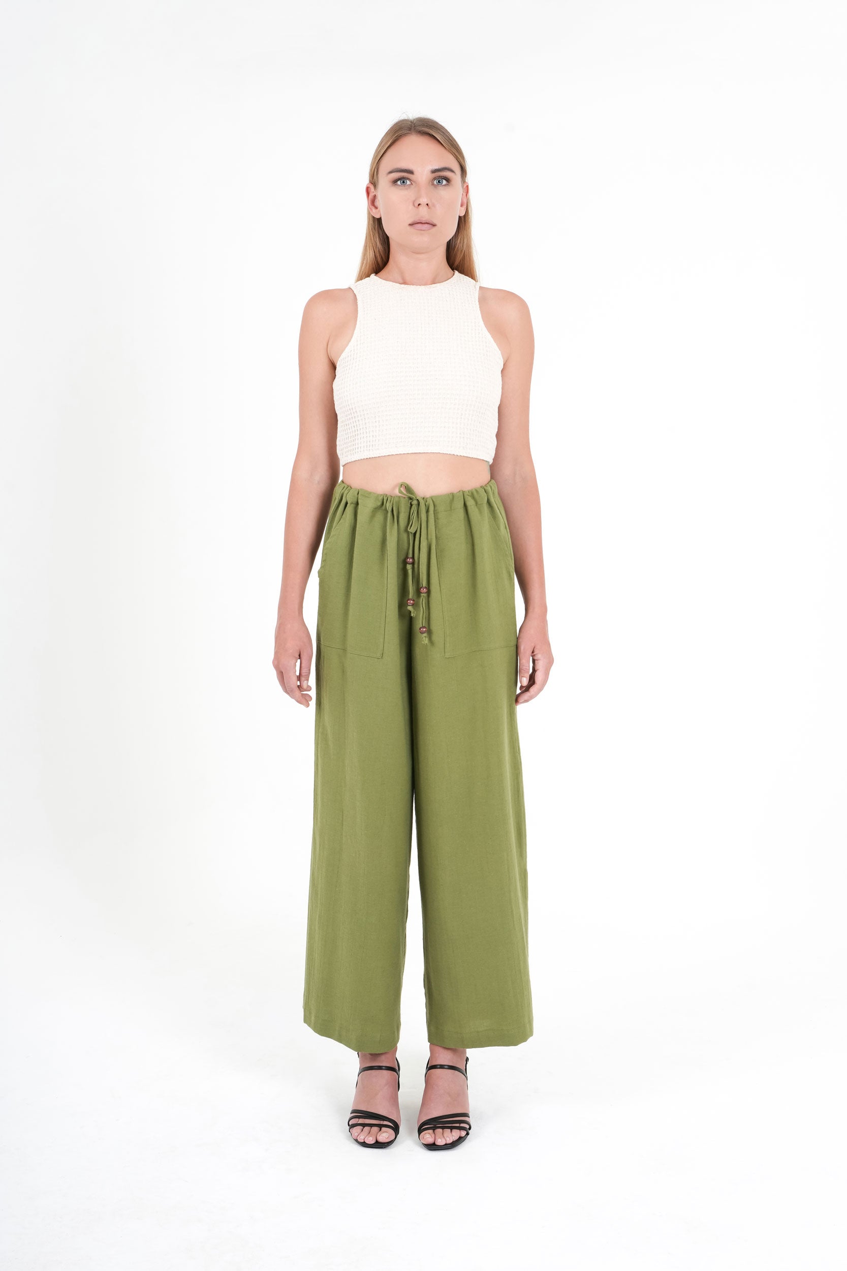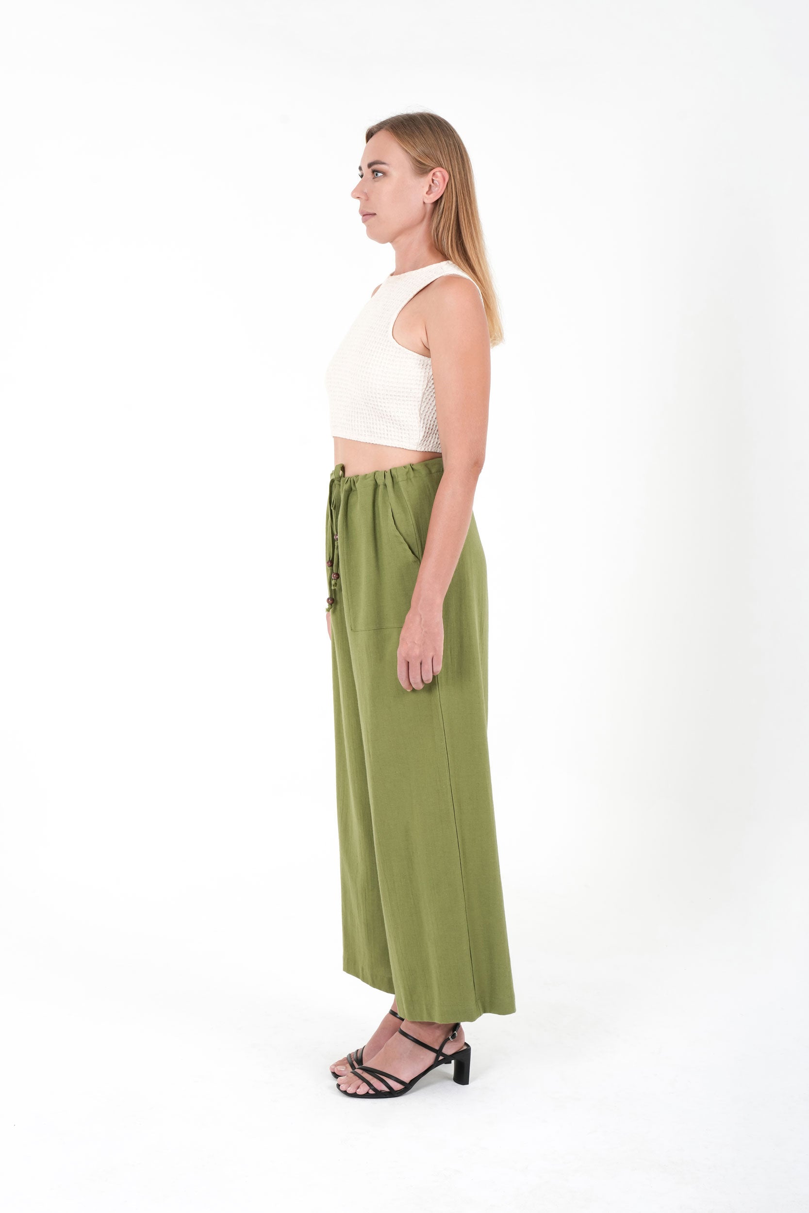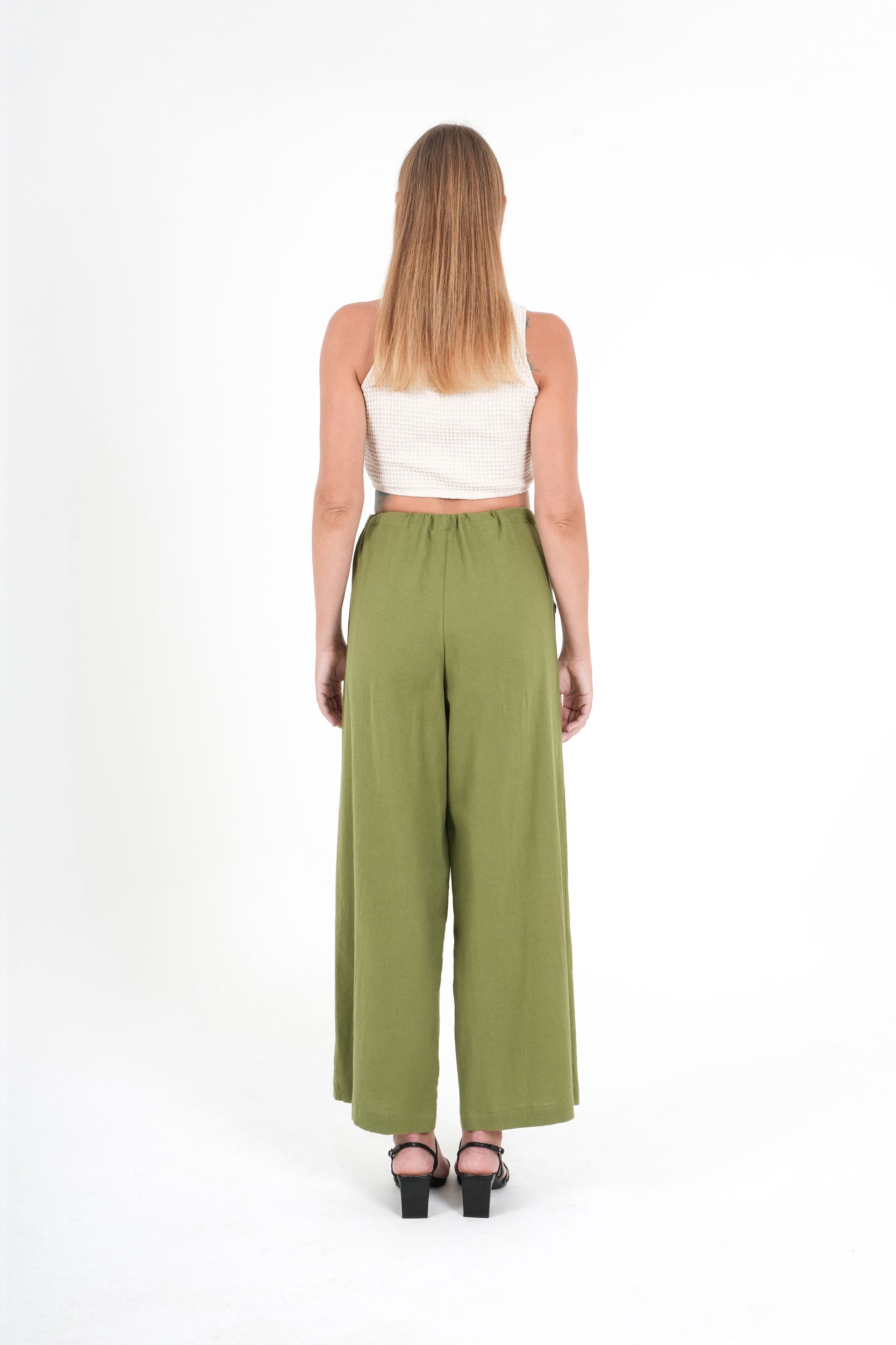 Add timeless ease to your wardrobe with these khaki wide-leg pants, crafted from a soft and airy blend of linen and double-layered cotton muslin.