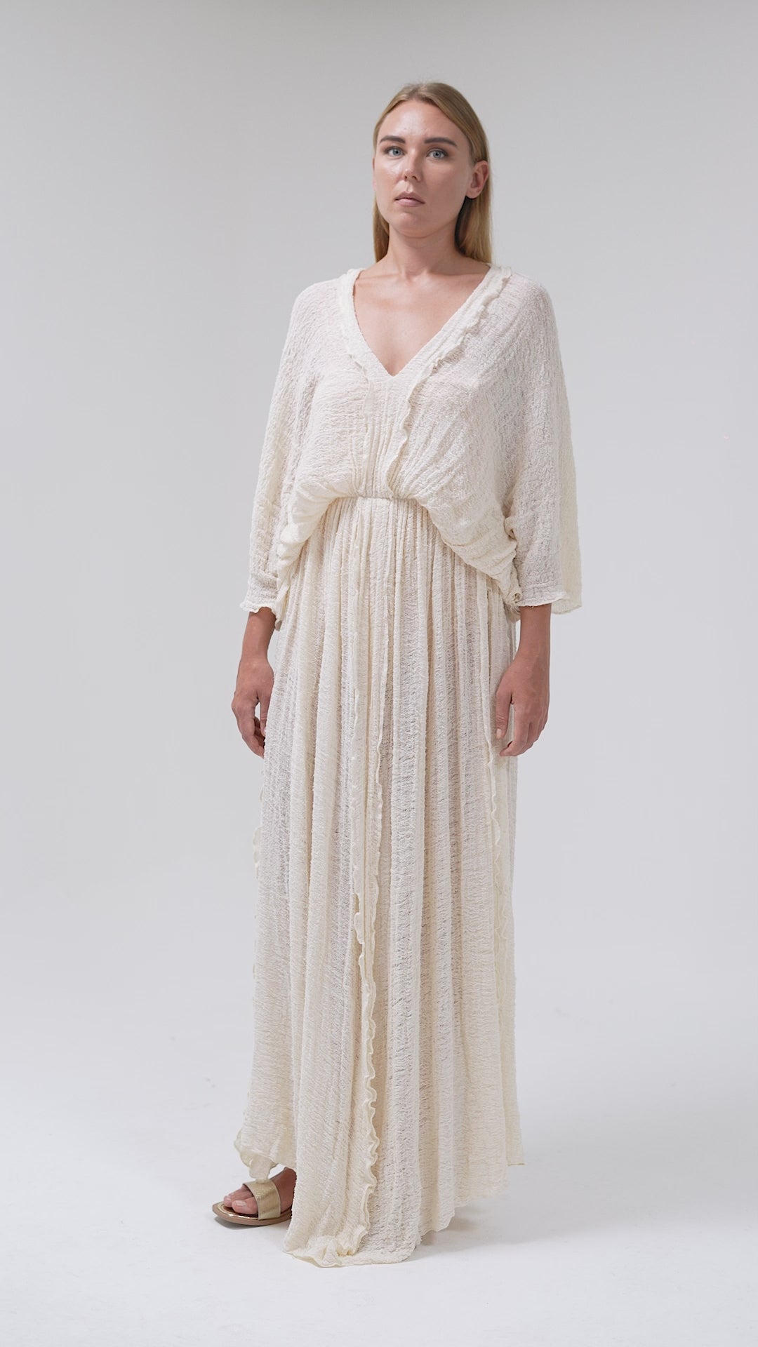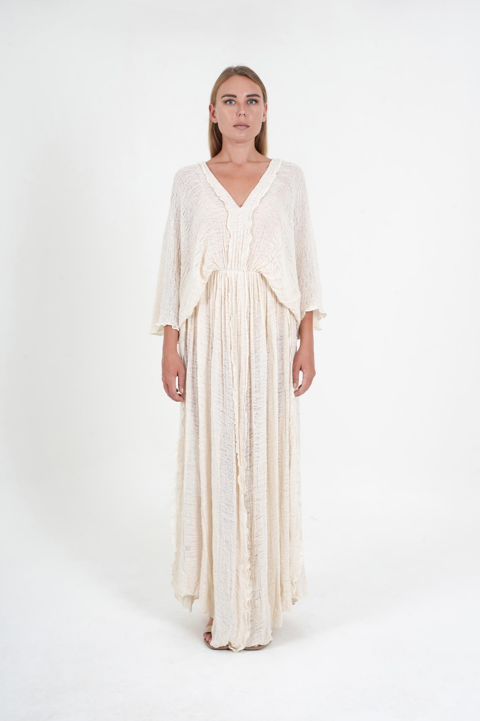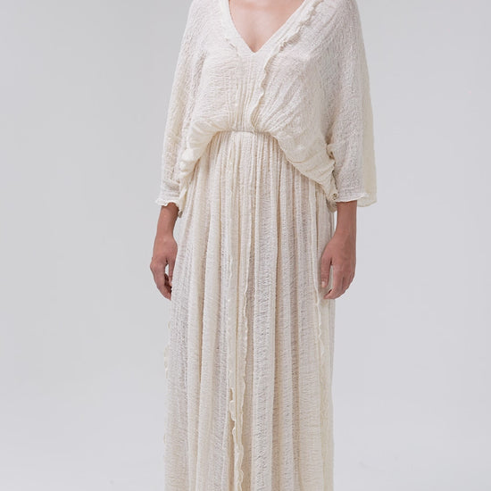 Crafted from Faralya fabric with a textured DASTAR-inspired weave, this dress blends traditional Mediterranean craftsmanship with modern elegance. The deep V-neckline and flowing silhouette offer effortless femininity, while breathable 100% cotton ensures all-day comfort.