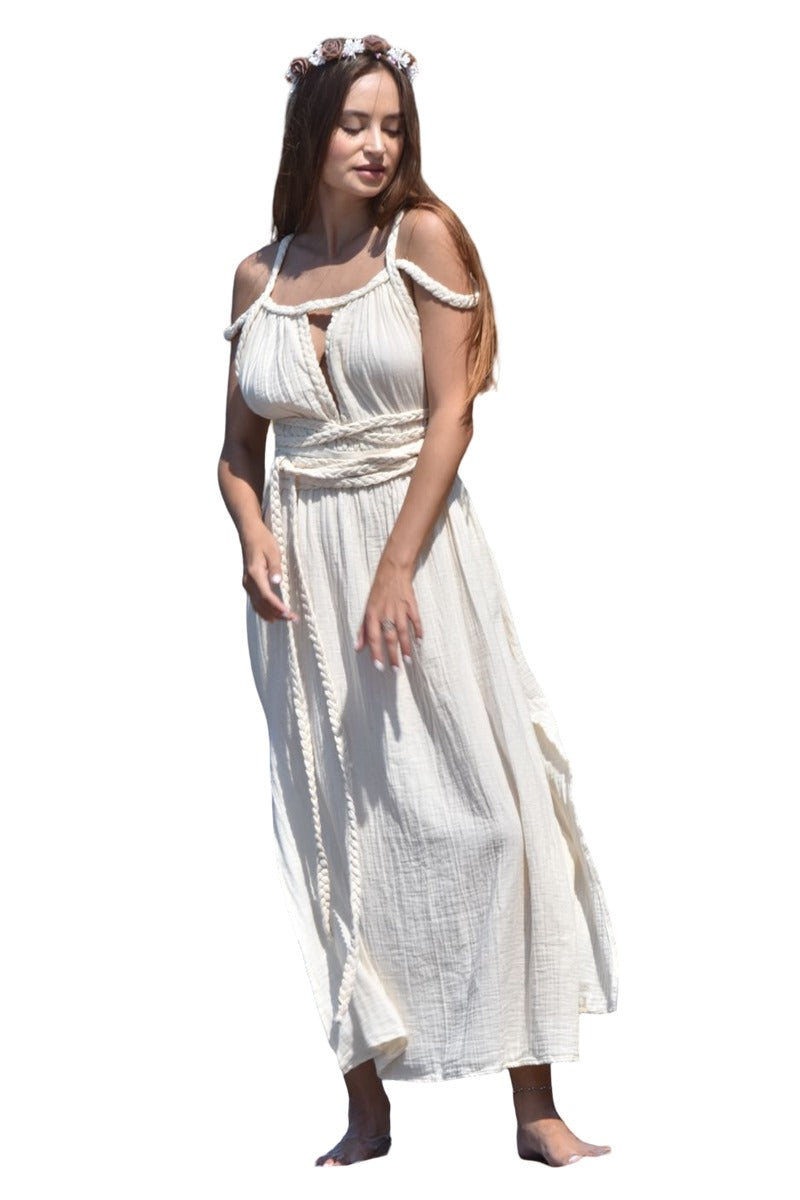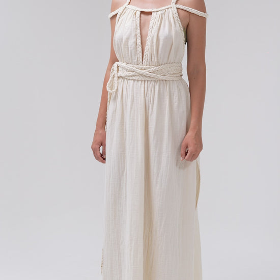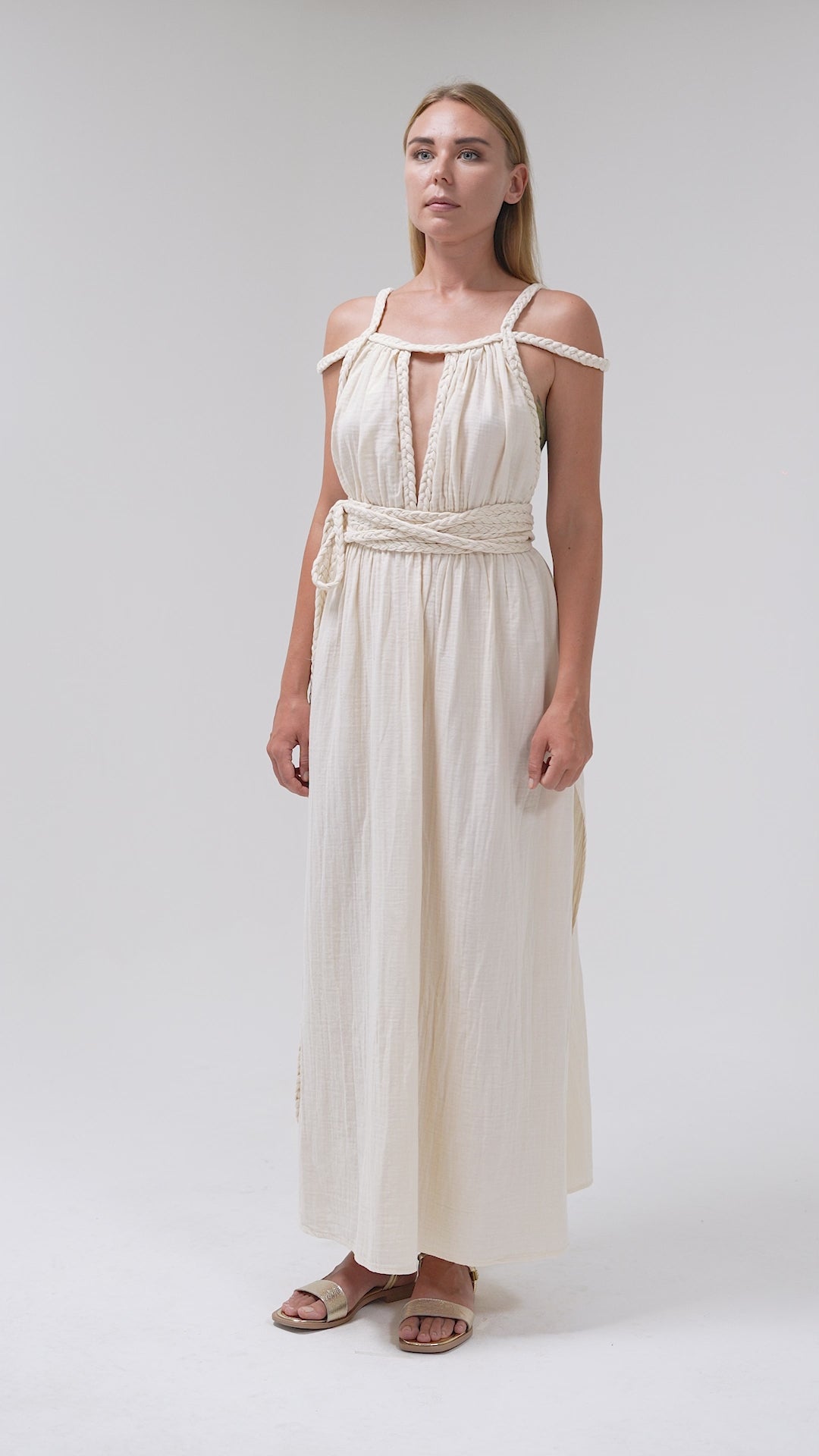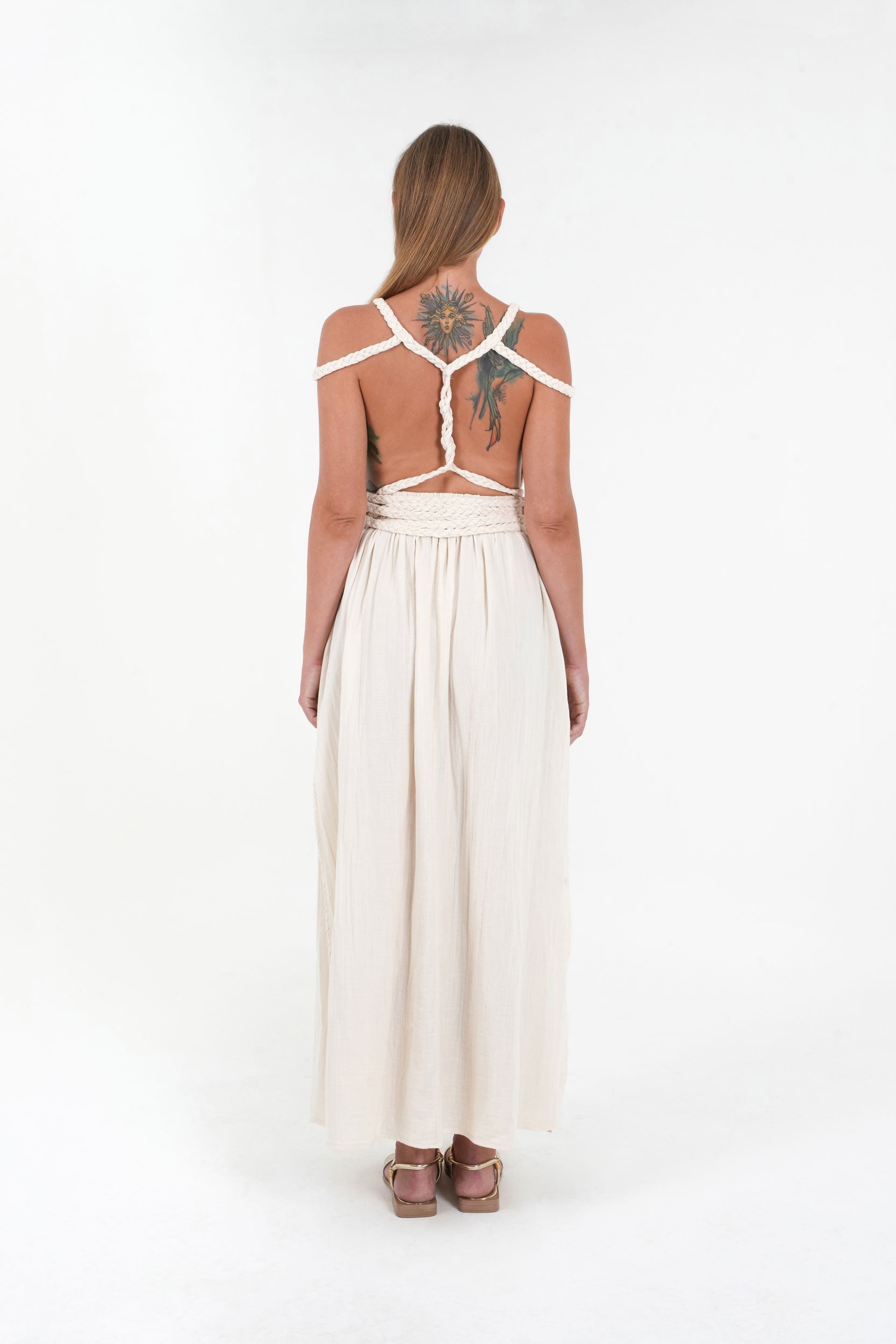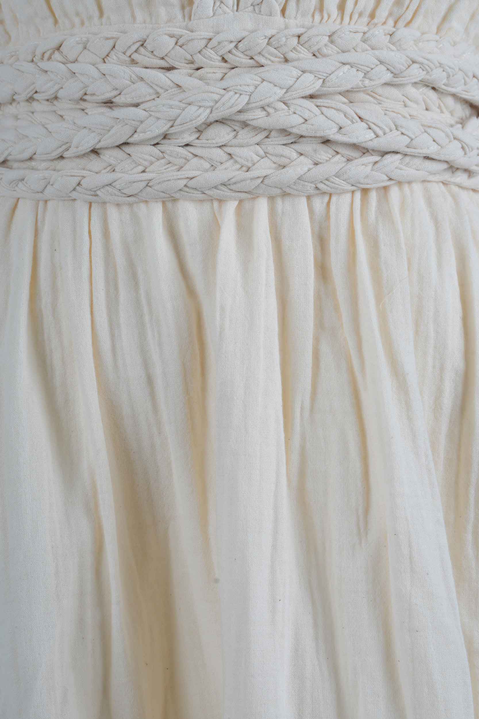 The braided details of our dresses are entirely handmade, with each braid carefully woven by hand. For every handcrafted detail, we use the same fabric as the main body of the dress to ensure harmony and continuity.