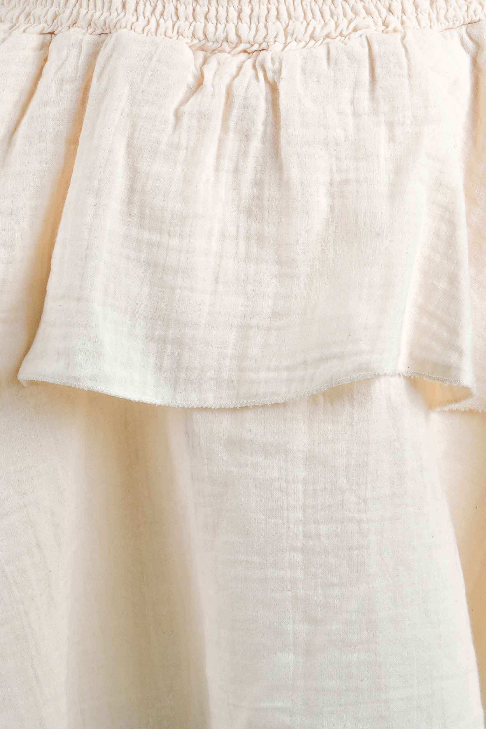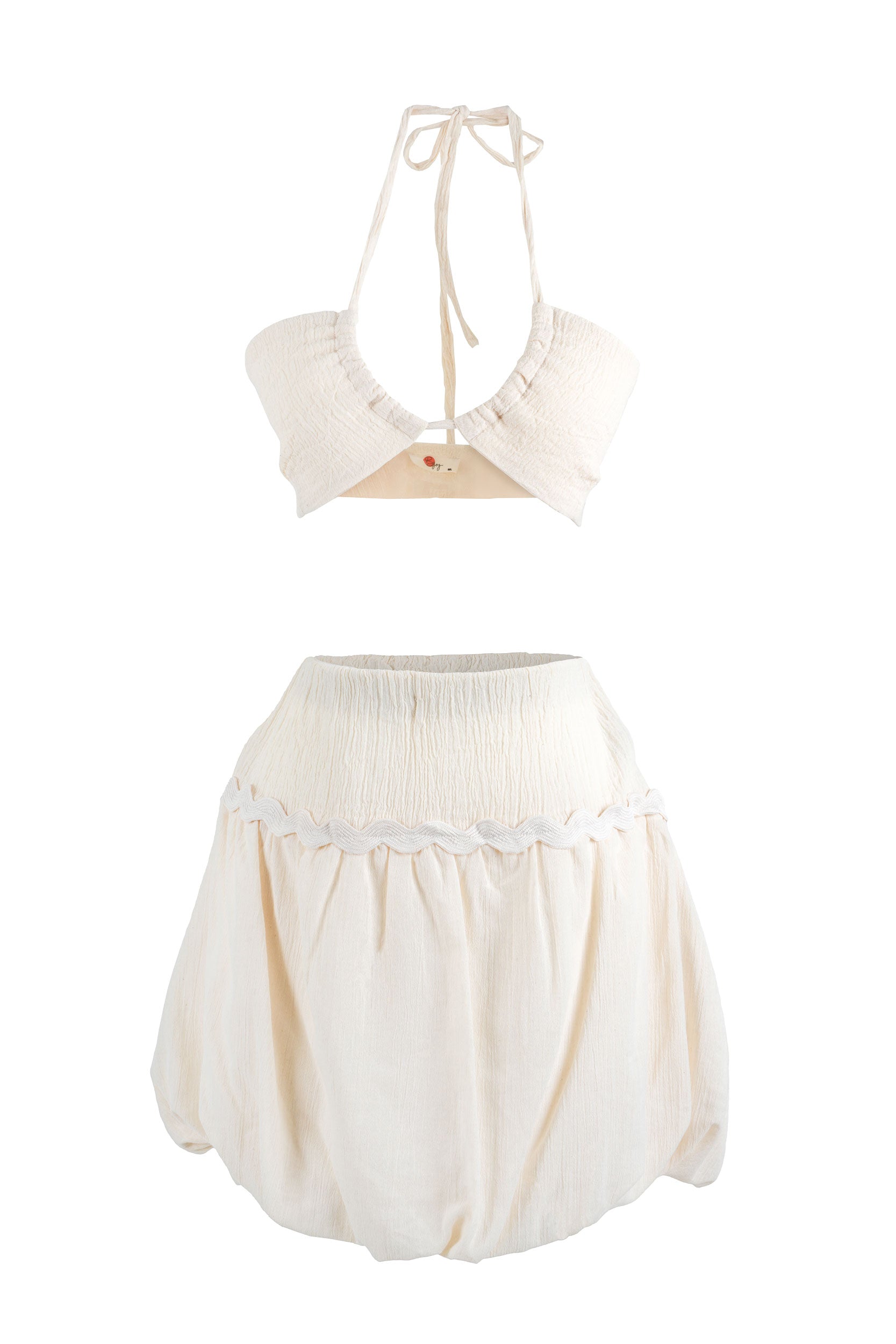 The set features a halter-style crop top with a gathered, plunging neckline and adjustable back tie. The matching mini skirt includes a smocked waistband and is adorned with natural wavy soutaches, offering a handcrafted, artisanal touch.